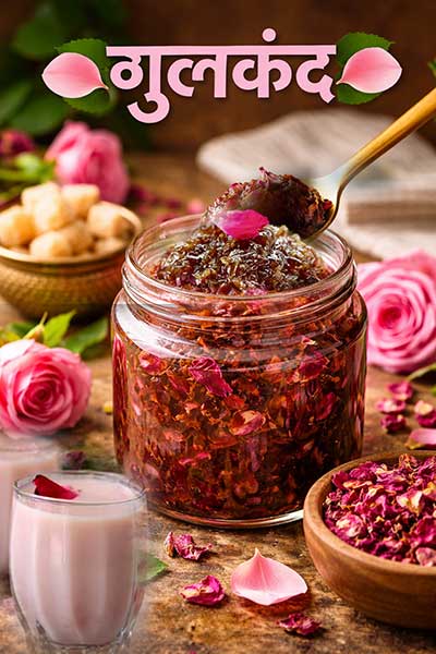 गुलकंद (Gulkand) शरीर की अतिरिक्त गर्मी को कम करने के लिए आयुर्वेद में बेहद लाभकारी माना जाता है। यह ताज़ी गुलाब की पंखुड़ियों और मिश्री से तैयार किया जाता है, जिसकी तासीर ठंडी होती है। नियमित रूप से गुलकंद का सेवन करने से शरीर में जमा पित्त दोष शांत होता है, जिससे मुंह के छाले, एसिडिटी, नाक से खून आना और अत्यधिक पसीना जैसी समस्याओं में राहत मिलती है। यह पाचन तंत्र को मजबूत करता है और कब्ज से भी बचाता है। गर्मियों में दूध के साथ या सीधे एक-दो चम्मच गुलकंद लेने से शरीर को प्राकृतिक ठंडक मिलती है और थकान कम महसूस होती है।