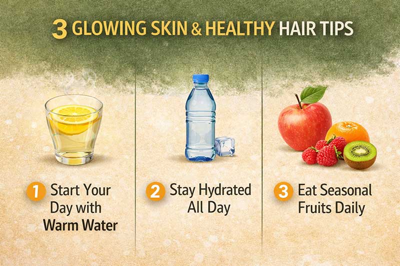 डिहाइड्रेशन का असर सबसे पहले चेहरे पर दिखता है—ड्राईनेस, फाइन लाइन्स और डलनेस के रूप में। इसलिए एक साथ ज्यादा पानी पीने के बजाय पूरे दिन थोड़ा-थोड़ा पीना ज्यादा फायदेमंद होता है।